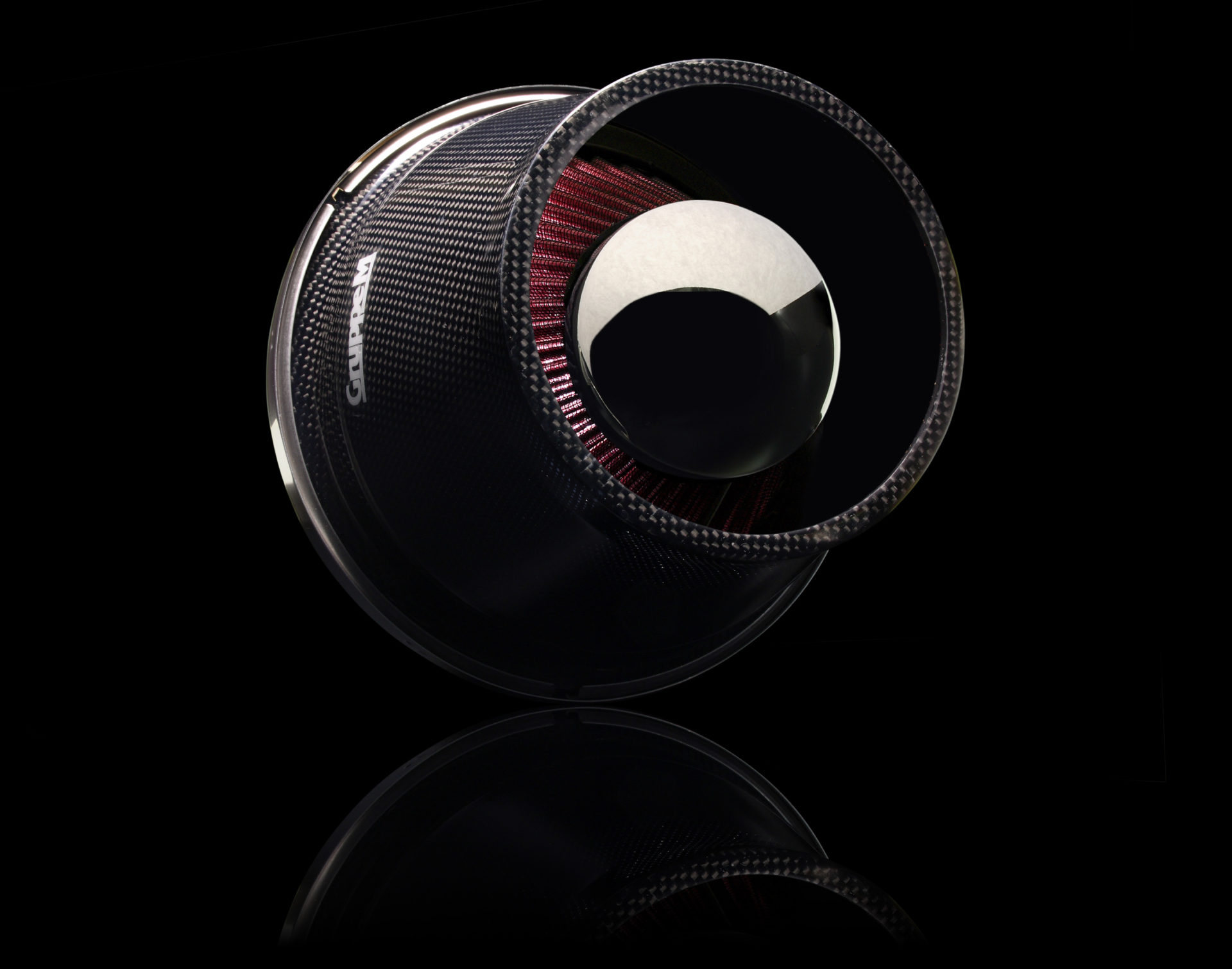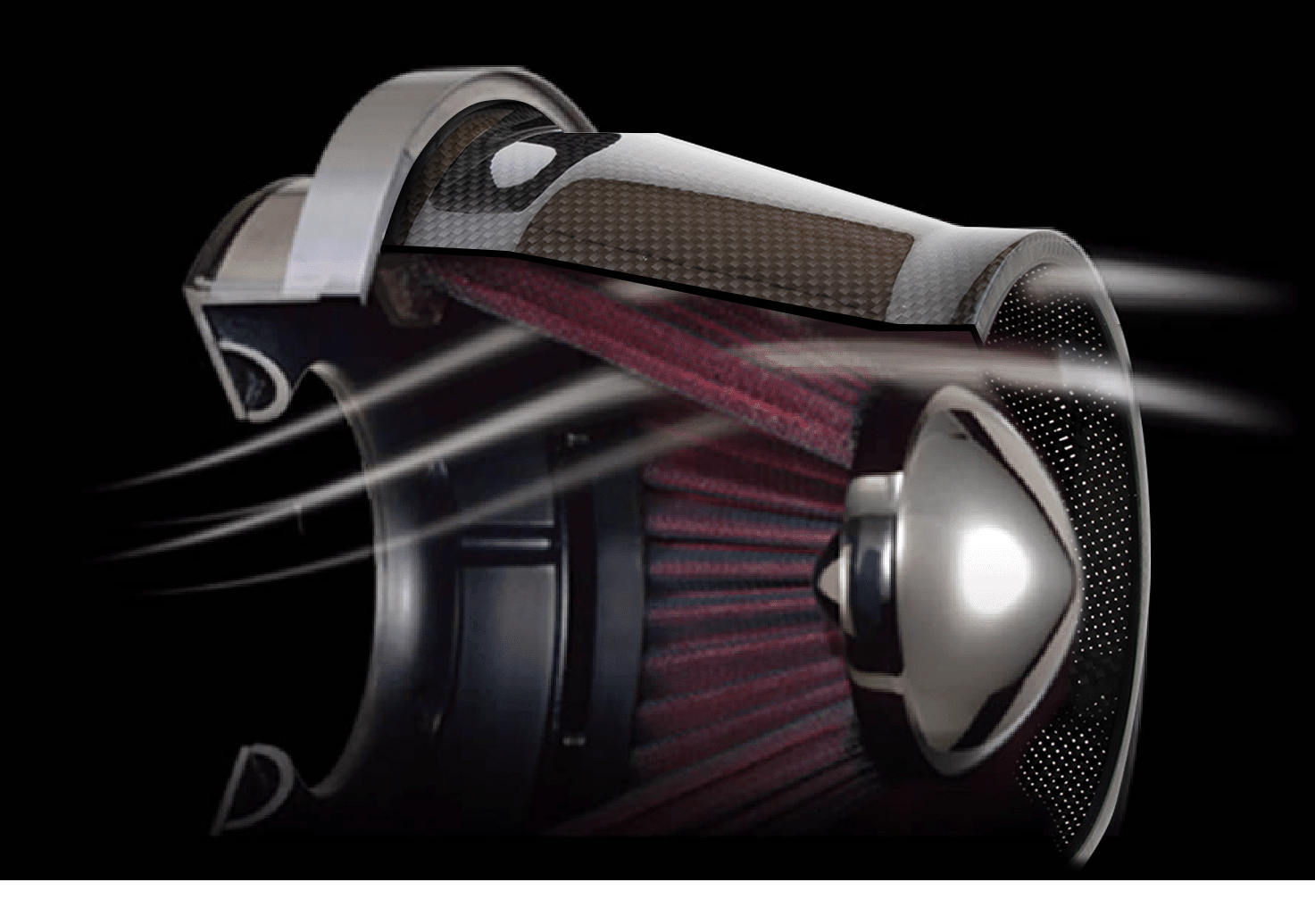 フィルター濾材には、集塵効果に優れる高密度コットン4層湿式を採用。 この濾材を円錐形にして、中央部にセンターコーンを配することにより、吸入空気の整流及び流速の向上を実現しています。(ジェット機のエンジンと同じ原理)熱を遮断するカーボン製のインテークダクトにより熱の影響を受けにくく、なおかつフィルター部分の形状設計により吸入時の流速が高められたことで、飛躍的に充填効率が安定、そして向上、高負荷連続吸気の性能低下を抑制します。