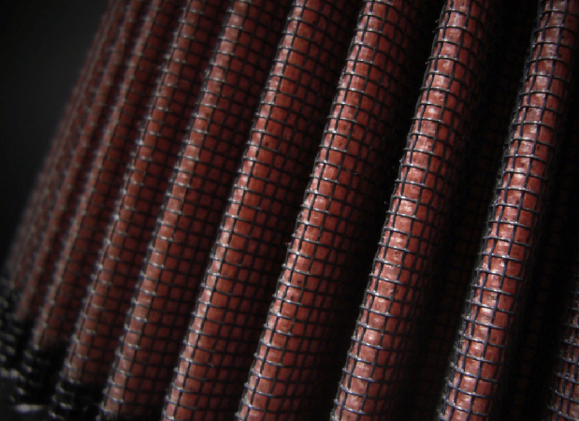 独自のフィルターデザインコンセプトに基づき一定のテーパー角をとり、ひだを深くとったアコーディオン形状の最適化を図ることで、外寸の5倍以上の表面製を持つハイフロータイプとしています。 強力な吸入負圧や熱による歪みを抑え、フィルタリングキャパシティを向上させることにより、大容量、高負荷連続吸気を実現しています。